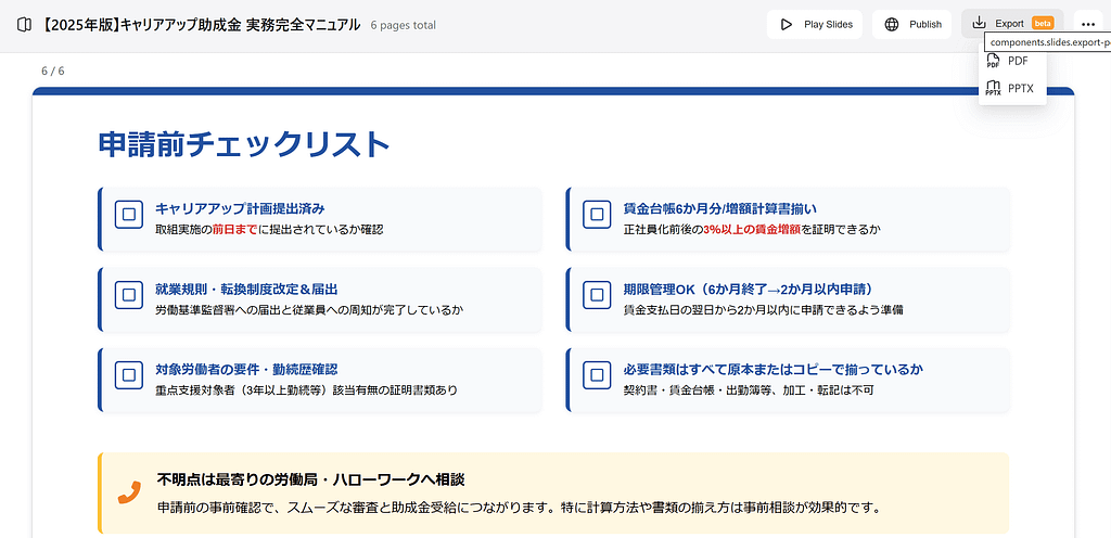 Gensparkのスライド出力は非常にスムーズですが、最終チェックを怠らず、「見せる資料」としての完成度を意識すると、より安心して社内外に共有できます。