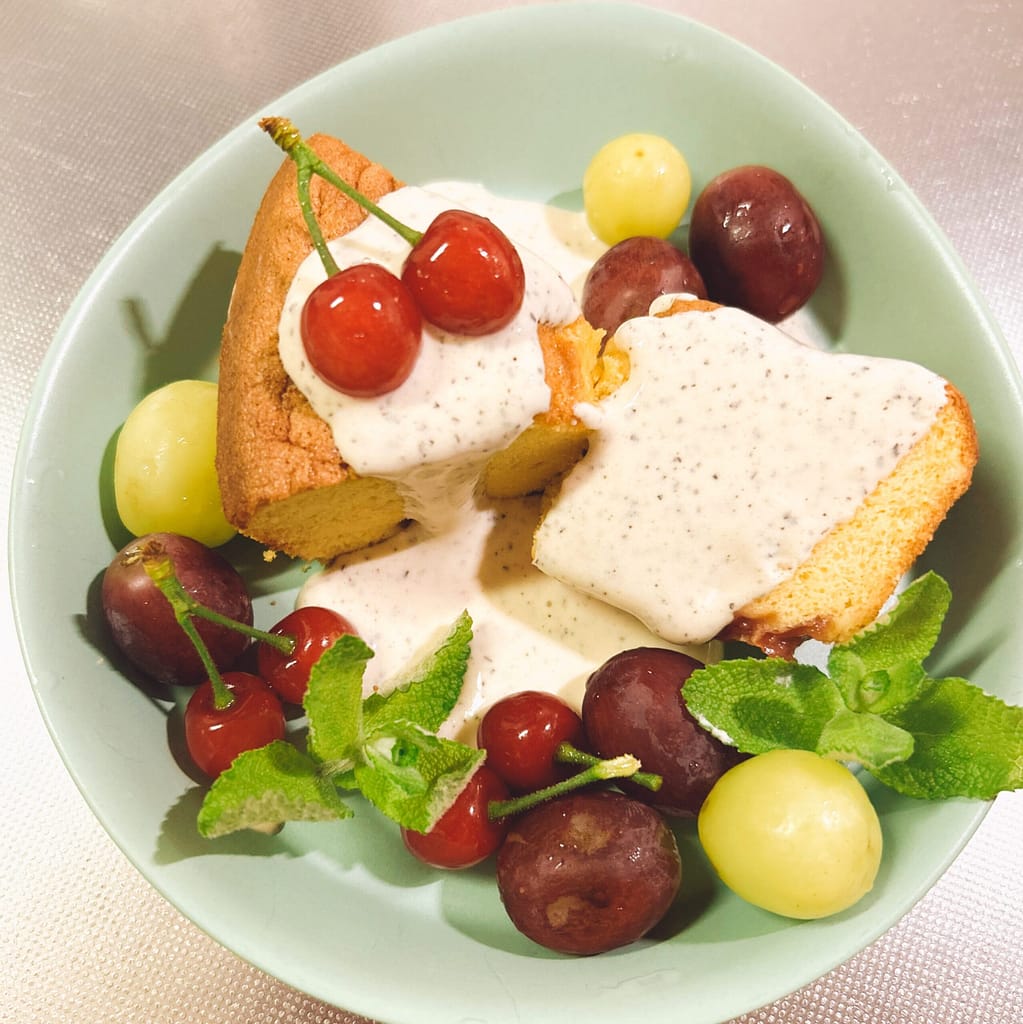庭のさくらんぼが赤く実ったので、今回は旬の味を楽しめる【さくらんぼ×米粉シフォンケーキ】を作ってみました。