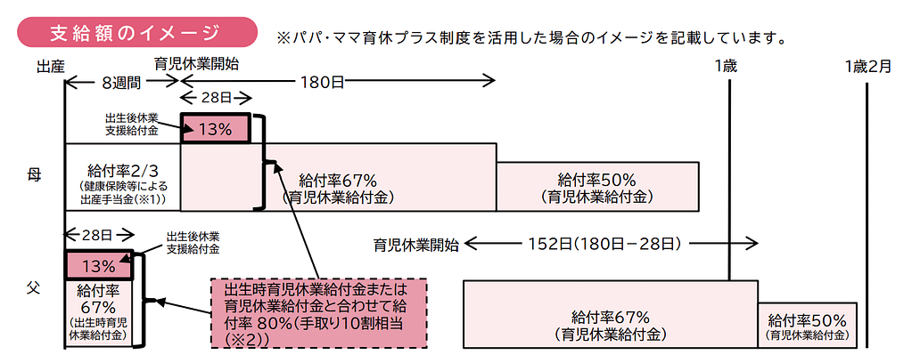さらに、一定の条件を満たすと、母親が受け取る育児休業給付金にも上乗せ(13%)が加算されるという仕組みもあります。